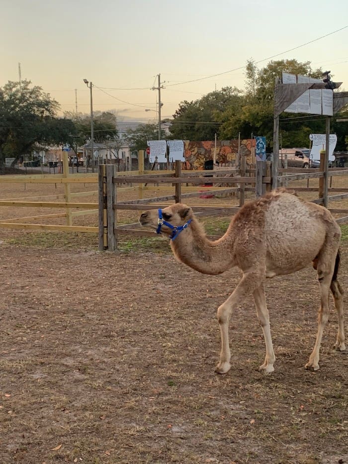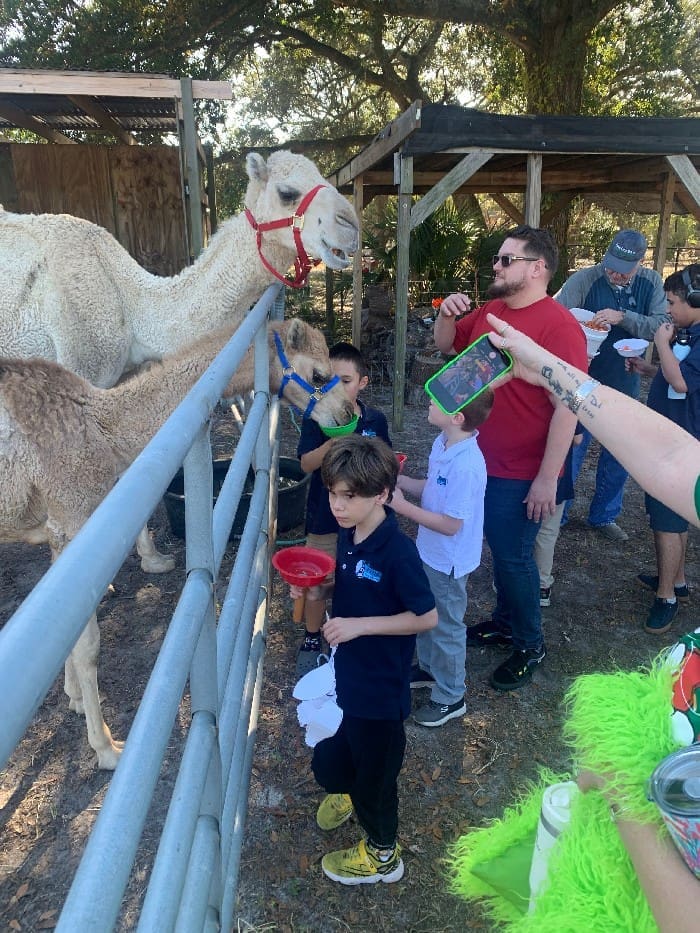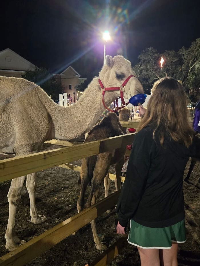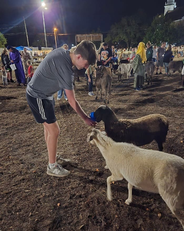The field features sheep, miniature donkeys, and two beloved camels — Naomi, a longtime favorite, and her young son Nicodemus (Nico), returning for his second year. Helping to keep things tidy are the “middle school shepherds,” affectionately known as super-duper scoopers, who make sure the field stays clean and safe for everyone.