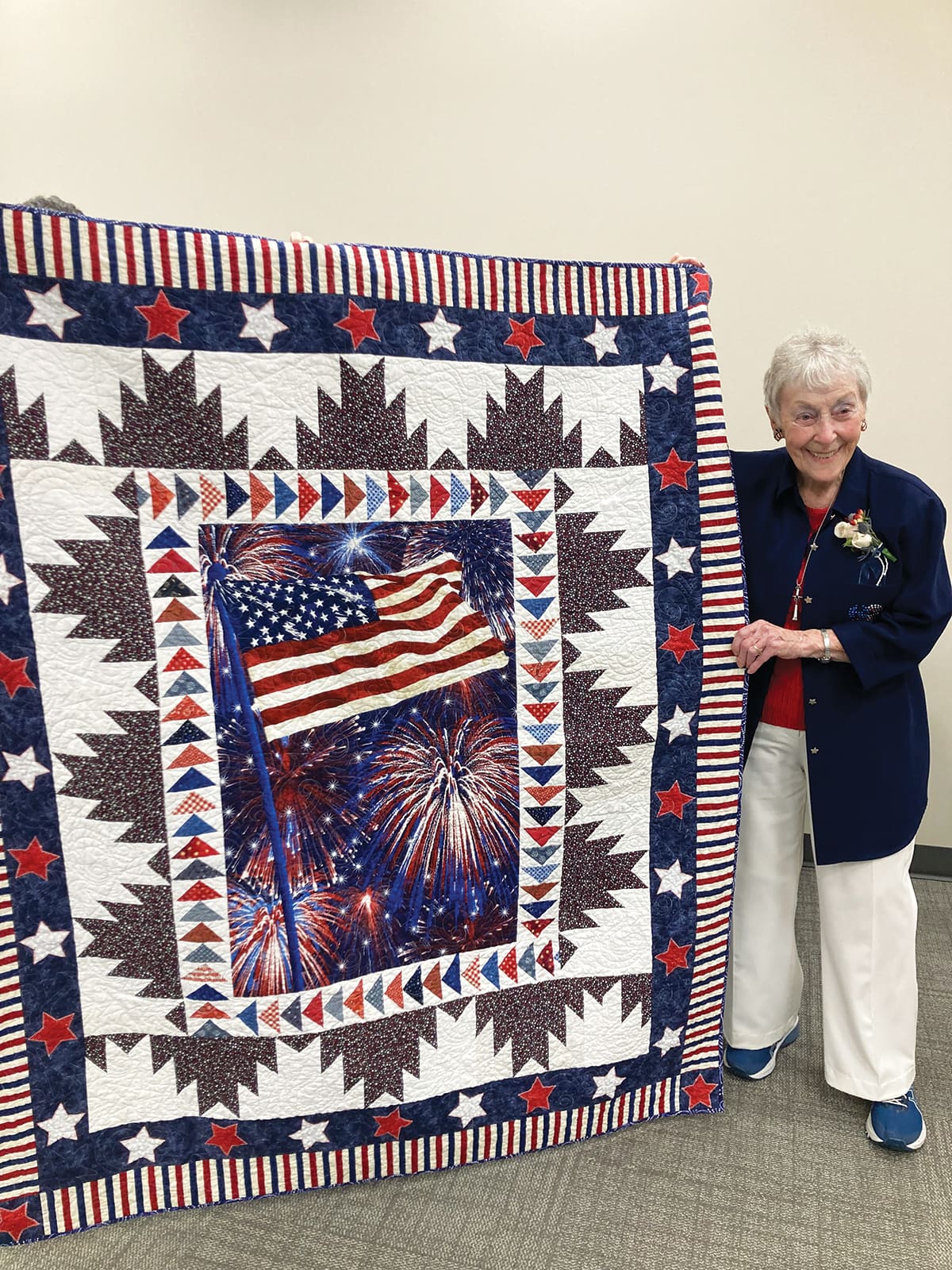 The Flying Needles Quilting Guild was personally thanked on the presentation plaque given to Constance in addition to the lovely Quilt of Valor itself.