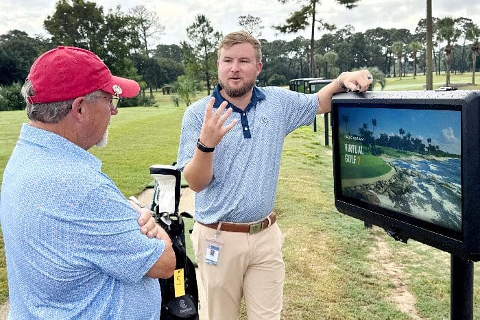 Fort Walton Beach Golf Club Director Jacob Hill, right, talks with a golfer about the club’s new Trackman Driving Range, which opened on Friday, Sept. 26, 2025.