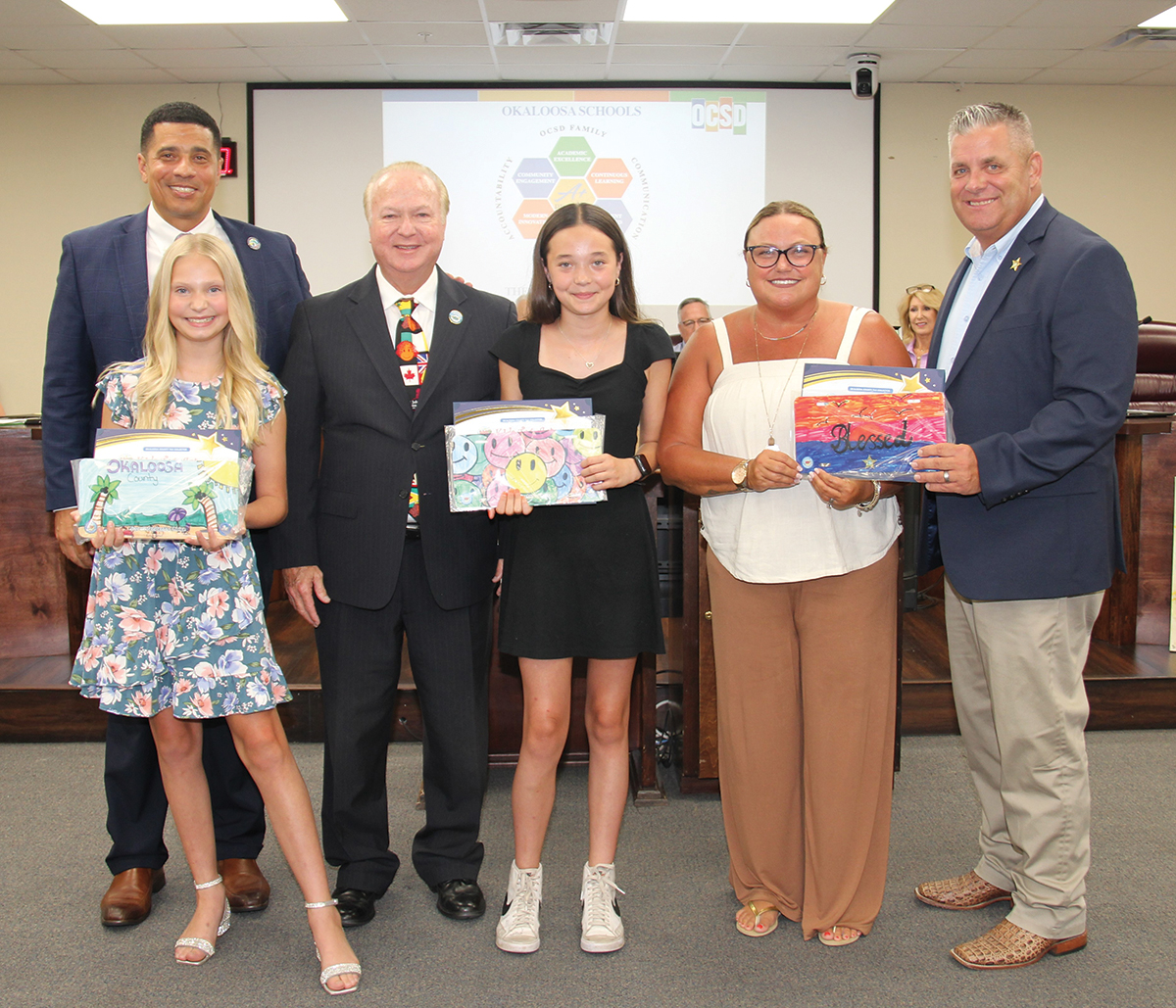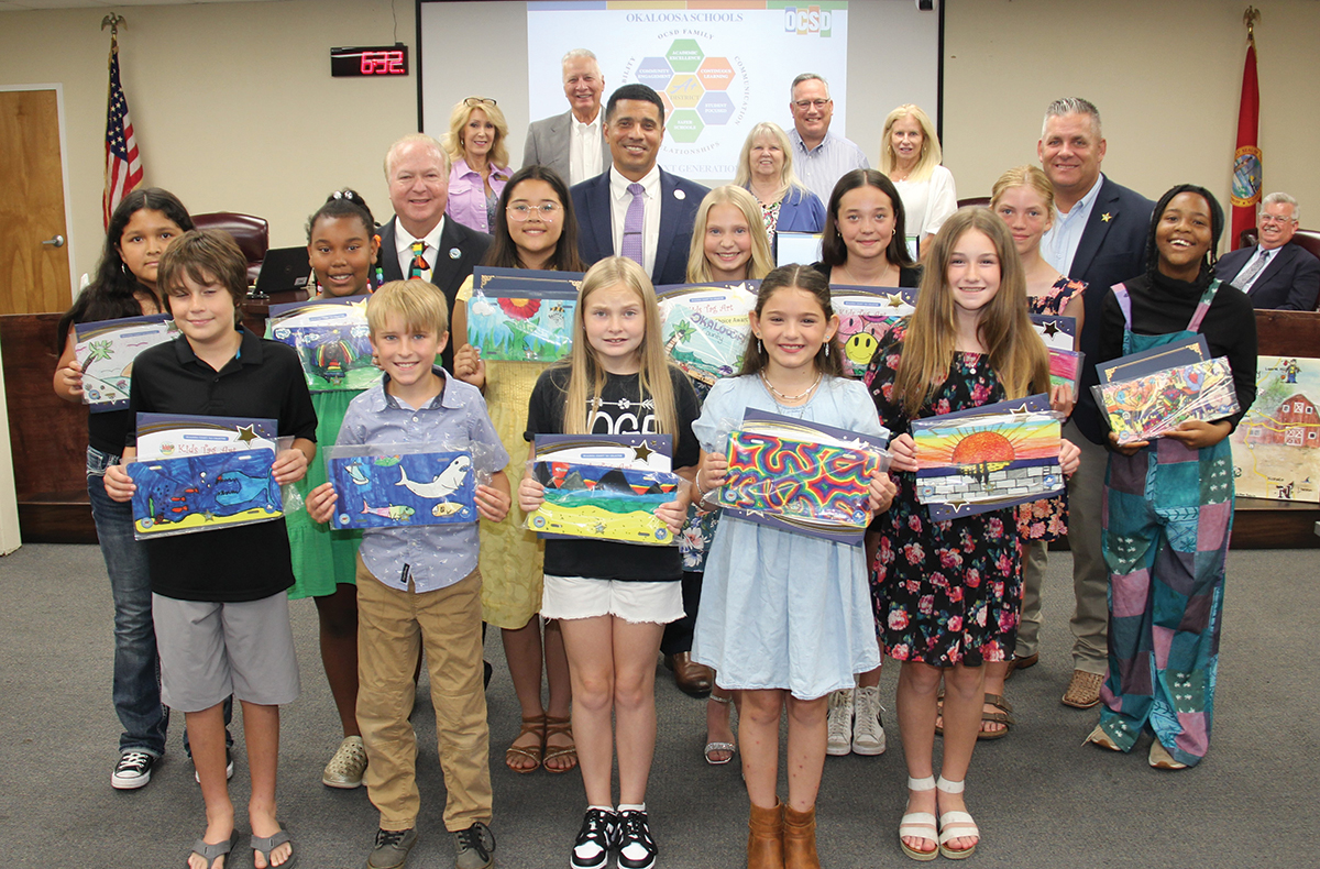 It was a full house at an Okaloosa County School Board meeting in June as Tax Collector Ben Anderson and Sheriff Eric Aden presented certificates to the Award of Distinction winners of the Kids Tag Art Program. Along with Superintendent Marcus Chambers, Anderson and Aden recognized two winners from each participating school.